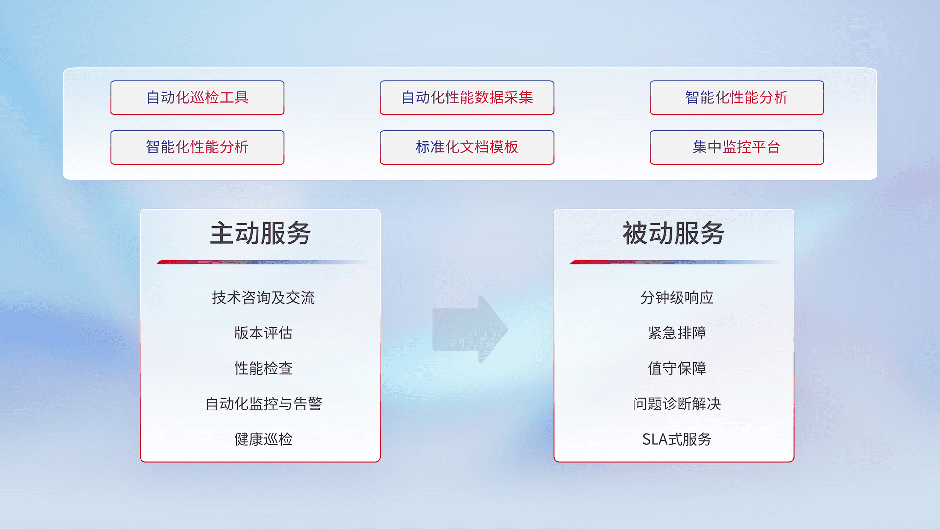 智能化工具和标准化文档,,,,保障服务质量,,提供主动服务(包含技术咨询、、、版本评估、、、、性能检查、、、自动化监控与告警、、、、健康巡检)和被动服务包含(分钟级响应、、、紧急排障、、、、值守保障、、问题诊断解决、、、SLA服务)。。。